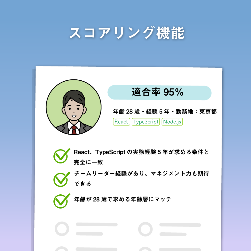 AIで簡単に理想の人材を見つけ、採用プロセスをスムーズに進めましょう。